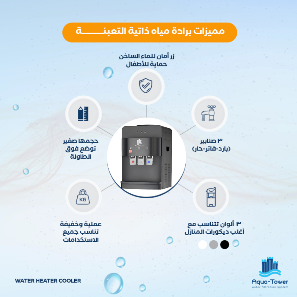 برادة مياه أكوا تاور – تصميم أنيق وكفاءة عالية استمتع بتجربة استخدام مريحة وعصرية مع برادة مياه أكوا تاور المتوفرة بمجموعة من الألوان الراقية: الأبيض، الأسود، الفضي، والذهبي. بفضل تصميمها الانسيابي وخزانها الداخلي الذكي، لم تعد بحاجة إلى حمل القوارير الثقيلة للحصول على مياه باردة أو ساخنة في أي وقت.