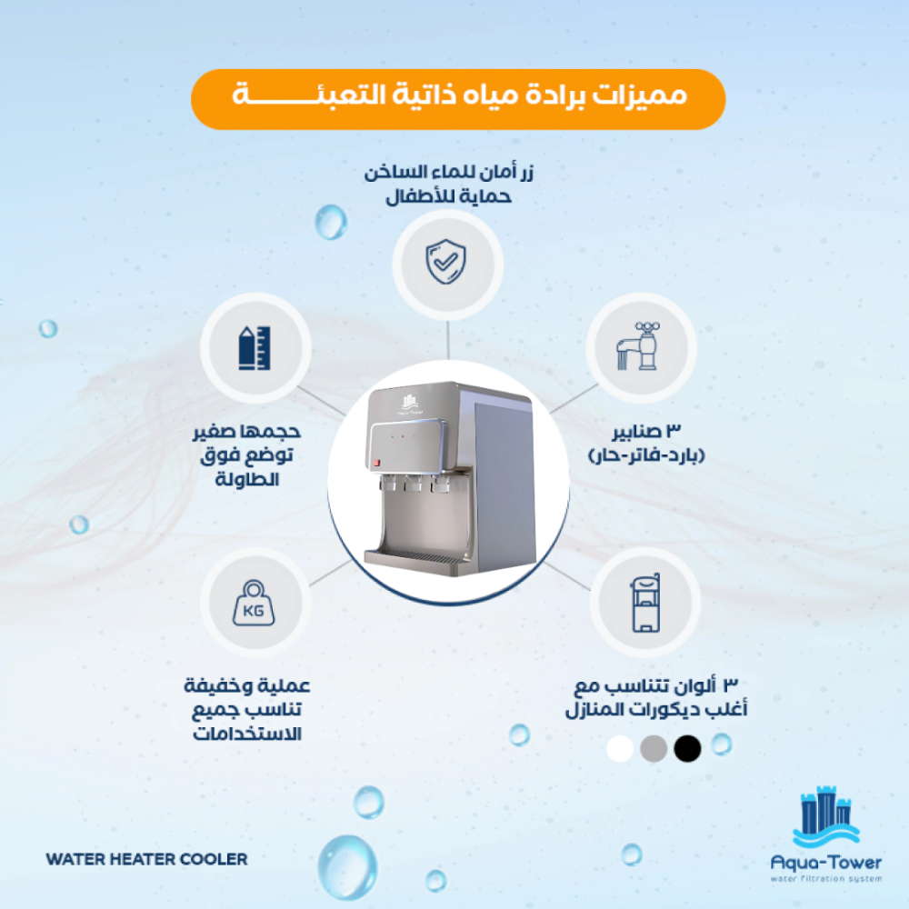 برادة مياه أكوا تاور – تصميم أنيق وكفاءة عالية استمتع بتجربة استخدام مريحة وعصرية مع برادة مياه أكوا تاور المتوفرة بمجموعة من الألوان الراقية: الأبيض، الأسود، الفضي، والذهبي. بفضل تصميمها الانسيابي وخزانها الداخلي الذكي، لم تعد بحاجة إلى حمل القوارير الثقيلة للحصول على مياه باردة أو ساخنة في أي وقت.